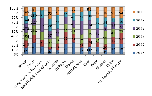 The immediate priority for the Eritrean health system is to train 4-6 staff on the principles and methods of cancer registration as soon as possible with the financial support of international donors and then to ensure that adequate finding, abstraction and coding of the cancer cases in the country are recorded and a mechanism of follow-up is established. Figure 5 shows the current reported cancer cases in the Eritrean Health care facilities from year 2005 to 2010 for both sexes and all ages. Data cannot yet be presented by sex and age groups, although in the relevant files the author witnessed at the central pathology laboratory, all these data are almost there, they just need to be abstracted, coded and entered into program to be analyzed. The second priority is to launch nationwide surveys of different cancer types in order to study the magnitude, prevalence, incidence, morbidity and mortality. This can be phased in by firstly establishing a cancer registry at the capital Asmara which could be called the Asmara Cancer Registry and then expanding it nationwide.