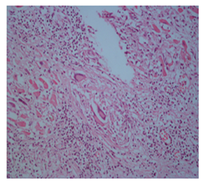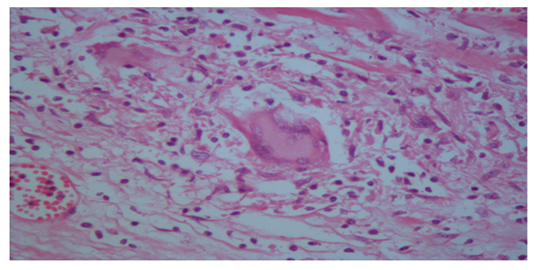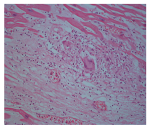 Our case was 34 years old male patient who had sudden loss of consciousness after discussing with another driver in traffic and he died on his way to hospital. The case brought to the Morgue Department of The Institute of Forensic Medicine of Adana, Turkey. Autopsy was performed and evaluated by two forensic medicine specialist and consulted to a pathologist. On internal examination, the heart weighed 340 g and thickness of left ventricular wall was 1,3cm, that of right ventricle was 0,1-0,3cm. Papillary muscles in both ventricles were fibrotic and showed disarrangement. Myocardial sections showed areas of fibrosis and dark-mottled areas. Microscopic examination of myocardial sections revealed connective tissue replacing normal myocardial muscle bundles; diffuse lymphohistiositic inflammatory cell infiltration, multinuclear giant cells (Figure 1). Microscopic sections of other internal organs showed no pathology other than hyperemia. On the basis of these findings, the final diagnosis was giant-cell myocarditis.