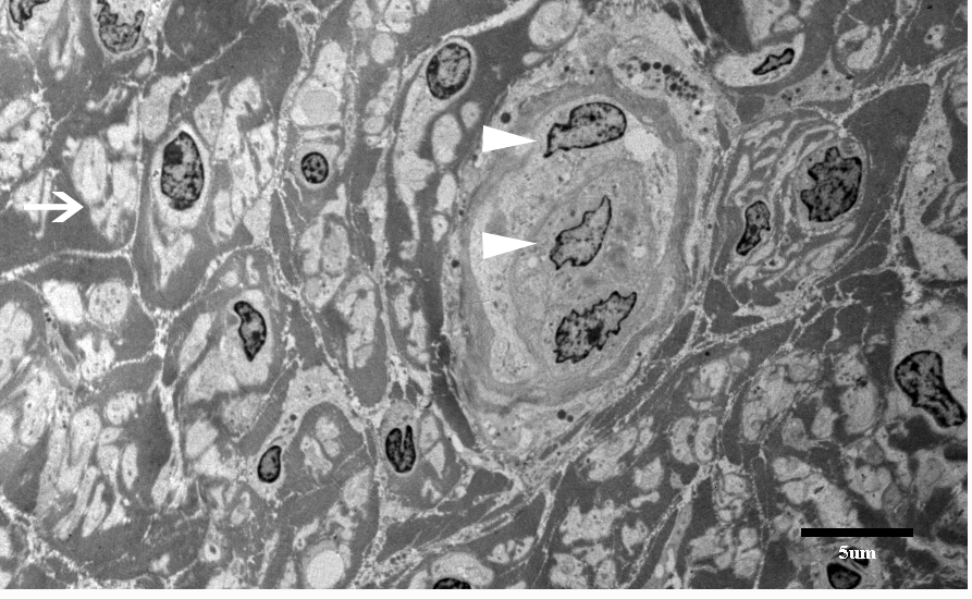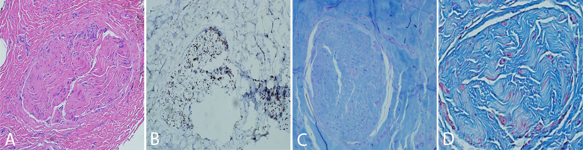 The nerve and muscle specimens from the lower extremity were received and processed per standard muscle and nerve workup protocols including enzyme histochemistry, special stains for nerve and muscle, nerve teasing, and electron microscopy. H&E stained sections of the nerve biopsy show cross sections of sural nerve and surrounding connective tissues (Figure 1A). Blood vessels show no evidence of vasculitis, and Congo red stain displays no evidence of amyloidosis. There is significant fibrosis of the peri-, epi -or endoneurium observed. These are best highlighted with trichrome stain (Figure 1D). Trichrome also shows no large myelinated fibers. A neurofilament immunostain displays evenly distributed and moderately diminished complement of axons (Figure 1B). One micron thick, toluidine blue stained sections display cross sections of several nerve fascicles. This stain shows a complete absence of thickly myelinated fibers (Figure 1C). No supernumerary Schwann cell accumulations are seen. Endoneurial vessels have enlarged endothelial cells. Ultrastructural analysis of these sections confirms the observations seen on thick sections (Figure 2). There is no discernible thick or thin myelin present around axons. Unmyelinated fibers have loosely arranged membranes around them, and Schwann cell nuclei are present. No supernumerary Schwann cells are present (Figure 2). The tease preparation displays strands of fibrous tissue without any discernable myelinated fibers.