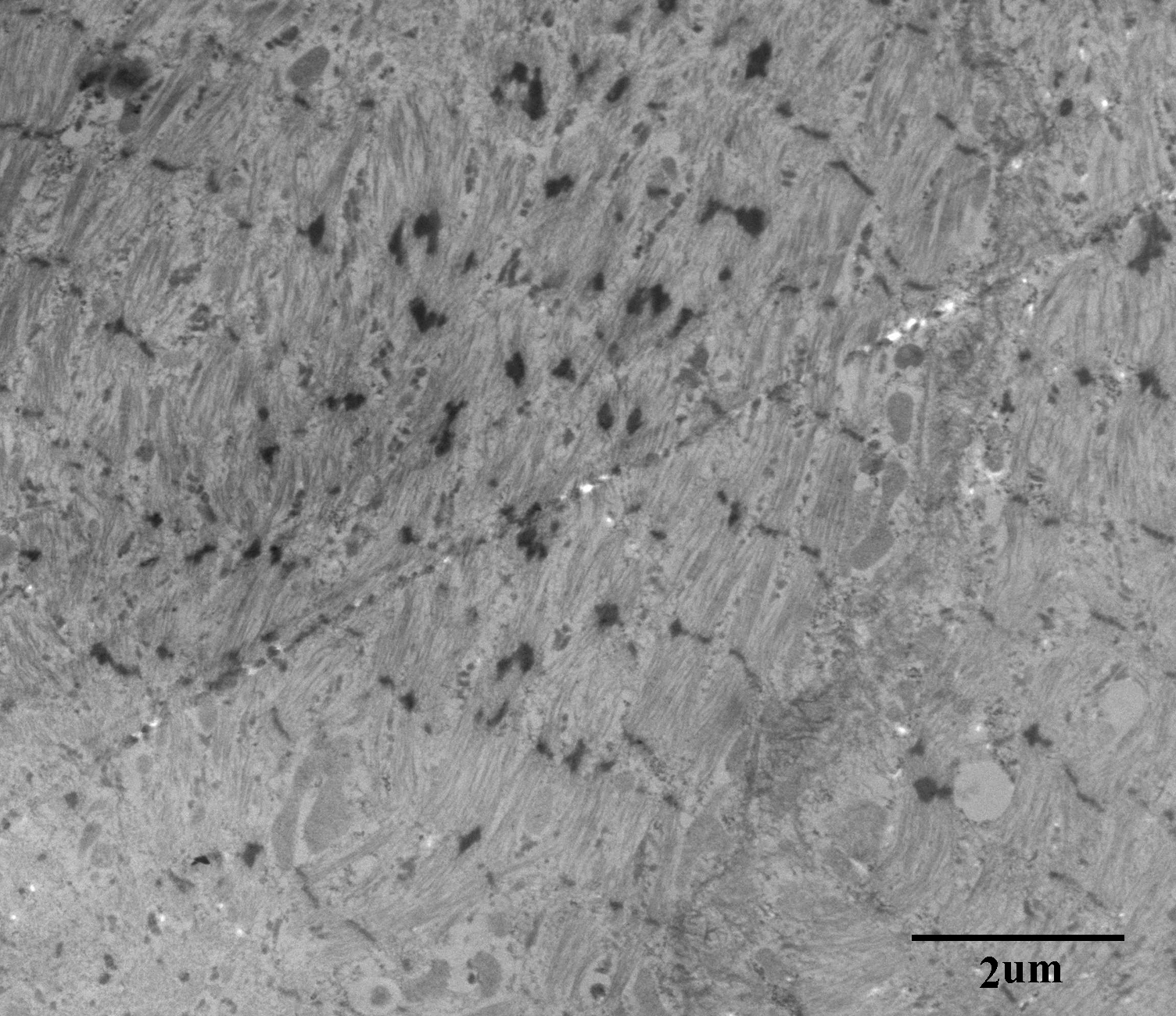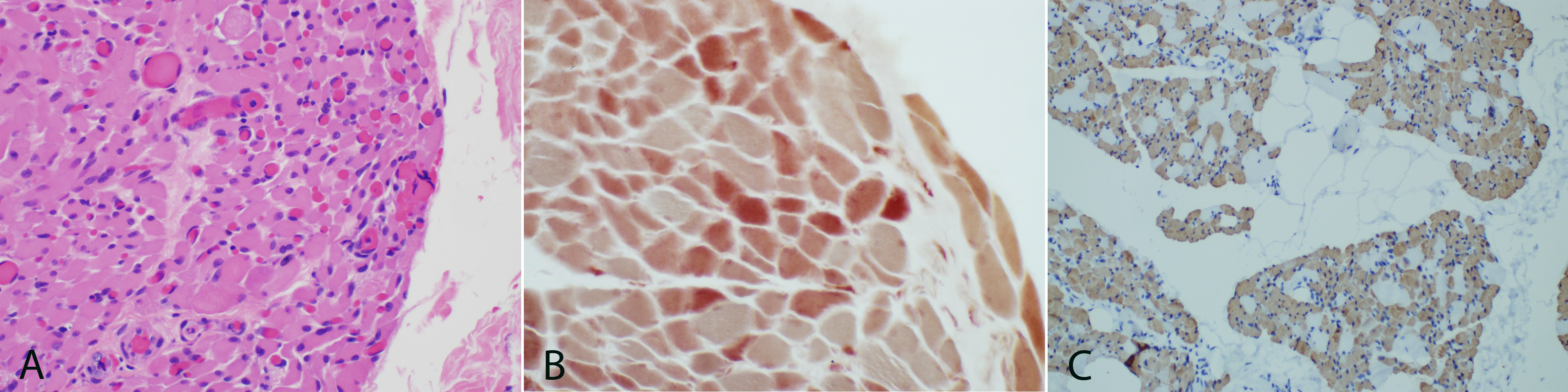One micro thick toluidine blue stained slides show atrophied muscle and connective tissues. Ultrastructural studies display muscle with normal glycogen and lipid content, normal structure and location of mitochondria, and no inclusions. The myofibrillar architecture is markedly disrupted and the normal myofilament Z-banding pattern is abnormal in many areas (Figure 4). Cytoplasmic bodies are also observed. H&E paraffin embedded sections show skeletal muscle in cross sectional and longitudinal array. Normal appearing perimysial connective tissues are seen. The myofibers are markedly and relatively uniformly atrophied with some variability in size and shape. Most show rounded contours, but some are acutely angulated. Immunohistochemical stains for fast myosin and slow myosin highlight a type 2 predominance of muscle fibers but a fairly normal checkerboard pattern of type-2 and type-1 fibers (Figure 3C). Immunostaining for major histocompatibility complex (MHC 1) fails to highlight any significant increase in staining. The finding of complete loss of myelin within the sural nerve and marked atrophy of myofibers confirms the diagnosis of congenital amyelinating/hypomyelinating neuropathy and myopathy.