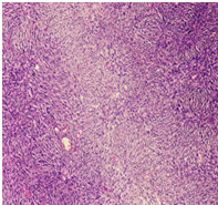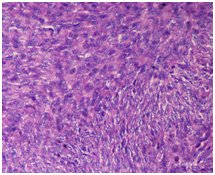 A 48-year-old male presented with swelling on the left breast. On examination, there was a nodular swelling about 13x10x5cm in size. It was non-tender and freely mobile over the pectoralis muscle. There was no discharge from nipple and no palpable axillary nodes. The fine needle aspiration cytology (FNAC) report was inconclusive. All the routine blood parameters and chest X-ray were normal. A wide local excision was done. Grossly, specimen consists of grey white nodular tissue bit measuring 13x10x5cm (Figure 1). Histopathologically, the slide showed storiform arrangement of tumour cells with uniform population of fusiform or spindle shaped cells with little variation in shape and size with scant cytoplasm (Figure 2) (Figure 3). Immunohistochemistry was done which showed positivity for CD34 (Figure 4).