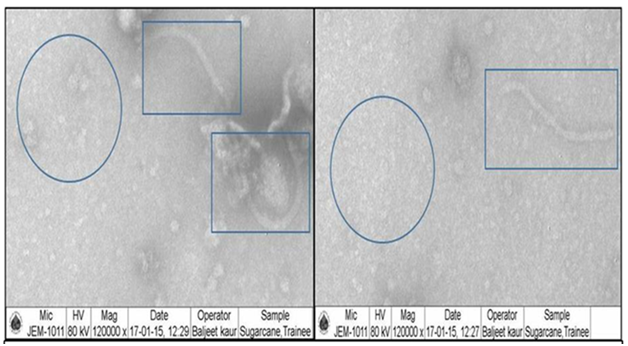 Figure 2 TEM photographs of partially purified leaf samples having mixed infection of SCMV (in rectangular boxes as flexuous rods) and ScYLV (in circle as small spherical/icosahedral particles)