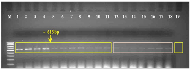 Total plant RNA isolation was carried out following both Trizol method following the standard protocol12 with slight modification as per our lab conditions. The RNA thus obtained was utilized for further RT-PCR using Eppendorf Thermocycler. RT-PCR was standardized for the detection of SCYLV for the local lab conditions. Primers SCYLV 613 F and SCYLV 613 R of coat protein region (CP) were used for the study with expected amplicon size of 613bp. All the samples were tested with RT-PCR and the samples showed positive reaction for the virus in RT-PCR test with presence of a band at around 613 base pair length confirming the presence of SCYLV in all samples (Figure 3). This confirms the earlier results13 where in the authors detected the presence of the virus through RT-PCR in almost all the 44 varieties tested in the study while only 34 entries showed the typical disease symptoms at field level. So, RT-PCR is used as a confirmatory test to determine the sensitivity of ELISA. Tissue culture plants derived ratoon crop of 87A 298 tested negative for the virus with RT-PCR affirming the DAS-ELISA reaction. Different serological techniques such as immunosorbent electron microscopy (ISEM), ELISA and immuno blot are available for the detection of the virus along with molecular tools such as RT-PCR. Production of highly specific antiserum to SCYLV, following purification of recombinant viral coat protein from E. coli, was reported to be highly specific and a reliable method for the detection of the virus in the infected host. Schenk14 developed tissue blot immunoassay (TBIA) technique using polyclonal antisera to detect SCYLV. Moutia & Saumtally15 reported suitability of double antibody sandwich-enzyme linked immunoassay (DAS ELISA), immune specific electron microscopy (ISEM) and TBIA for the detection of the virus from the suspected sugarcane clones. They also found the presence of the virus in many of the asymptomatic plants through these techniques. Korimbocus16 expressed the virus coat protein and read through domain of SCYLV in a bacterial expression system and using the purified protein they have developed monoclonal antibodies. They have developed TBIA to detect SCYLV using the serum. TBIA has been the most widely used technique to detect the virus in different countries.14,17,18 Subsequently RT-PCR was developed to detect the virus in sugarcane.