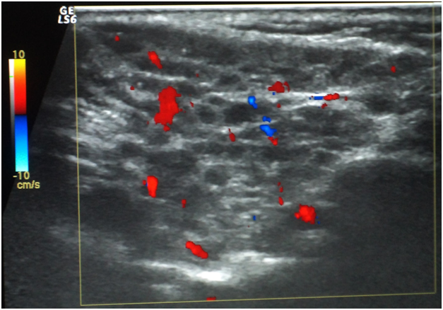 Oral ulcers, especially of the labial mucosa and tongue (Figure 1), were the commonest oral find in GBS while labial numbness, especially in the lower lip, enlarged major salivary glands, and xerotomia were very characteristic of SS. The commonest ocular manifestation in GBS, on the one hand, was intermittent uveitis whose severity ranged from mild to severe while cases of SS have presented typically xerophthalmia. No blindness was reported in the interval of the study as regards cases of GBS. Analogously, no cases of SS did run a transformation course into lymphoma or any other malignancy. Neuro-Behçet involvement and brain aneurysms in GBS, on the one hand, and the follow-up of SS cases, on the other hand, were assessed periodically by MRI. Normal images were obtained in the eighteen cases for this 3-year-old study (Table 1). Sonographically, superficial structures of the head and neck in GBS and SS were assessed. For cases of GBS, a single case has shown a subacute atherosclerosis in the carotid artery but no salient glandular changes were sonographically evident. However, cases of SS revealed a glandular parenchyma of heterogeneous echopattern. There were unmistakable bilaterlal diffuse miliary cystic cavities with patchy calcifications, spotting the underlying atrophic parenchyma. This has overtly promoted a “honeycomb” appearance on the sonograph. No other salient finding could be accentuated (Figure 2).