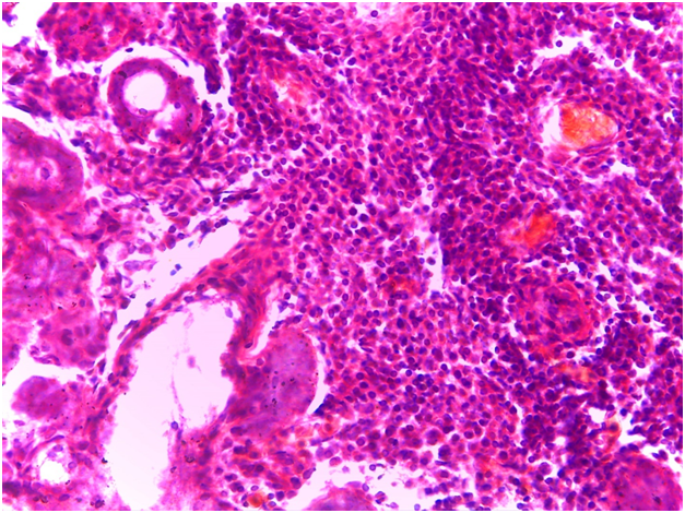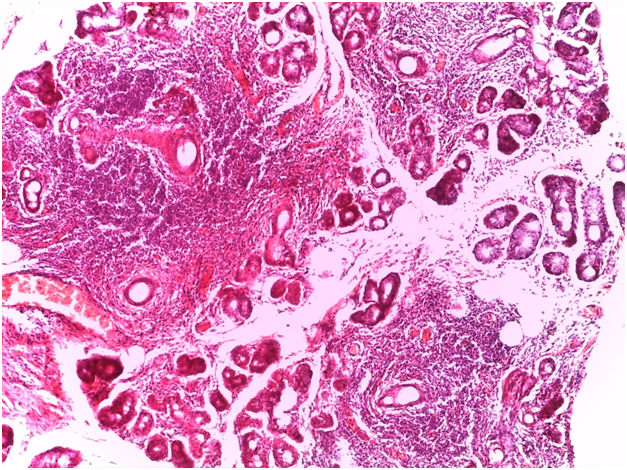 For Sjögren’s syndrome, salivary gland biopsy specimens have shown numerous lymphocytic foci in 4 mm2 (count > 50 lymphocytes per focus) within the glandular parenchyma. Acinar degeneration and few epimyoepithelial islands were detected. There was no substantial confluence of lymphocytes in a germinal-center-orientation within the submitted cases (Figure 3 & Figure 4). Focusing on characterizing any histopathological changes in GBS, the submitted cases of GBS revealed, in the asymptomatic glandular specimens, conspicuous perivascular and periductal infiltrations of neutrophils and macrophages. Moreover, vascularity was richer than that of normal mucosa whose vascular components were inconspicuous. Hemorrhagic spots, intervening extravasation of RBCs as well as dark acini, comparable to dust cells in smoking alveolitis, were also evident (Figure 5 & Figure 6).