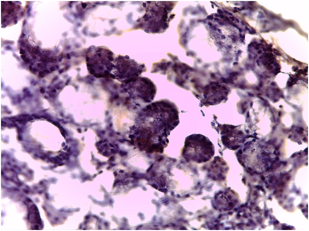 minutes. Treating with protein block serum at room temperature, sections were covered with primary antibodies; Cathepsin K (3F9, Abcam, Dilution 1:300), CD 16b, practical in the detection of neutrophils (48kD, Polyclonal, Dako, Dilution 1:500), CD 34, valuable in the recognition of hematopoietic precursors, capillary endothelia (105-120kD, Polyclonal, Dako, Dilution 1:500) and CD 68, (110kD, Dako, Dilution 1:500). Immunoreaction was performed using the labeled streptavidin-biotin method incubated overnight. For all antibodies, negativity or positivity was automatically evaluated, scaling at the “hot spot” in the selected fields. Area fraction was measured, using ImageJ software, to estimate the score of immunoreactivity. In doing so, (-) was designated for an immunoreactivity of 0-4%, (+) was labeled for 5-25%, (++) was denoted for 26-50%, (+++) was symbolized for 51-75%, and (++++) was assigned for 76-100%. Moreover, a total of 12 paraffin bocks, from recent archival cases of normal salivary glandular specimens, extracted from normal glandular tissues in minor surgeries, were contrasted to the studied pathological cases. The paraffin bocks were sectioned, 4μm thickness, and processed as aforementioned to be correspondingly stained by CD 16b, CD34, CD68 and Cathepsin-K.