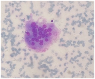 A 35 year old female, presented with complaints of back pain since one year, difficulty while walking, and weakness and loss of sensation of bilateral lower limb since six weeks. She was investigated and started on Antitubercular treatment (ATT) for the same problem in the other hospital on the basis of MRI report which suggested Pott’s disease. Symptoms persisted even after completion of six months course of ATT. After two months, ATT was started again from local center without improvement in the symptoms. So, the patient presented to the hospital for the aggravation of symptoms. On examination, she had tenderness over lower dorsal region with muscle power of grade 2 in the right lower limb and grade 1 in the left lower limb. There was bilateral decreased sensation from T12 dermatome and below and complete loss of sensation from L4 dermatome and below. Previous diagnosis was challenged and Fine needle aspiration cytology (FNAC) of the lesion was done. FNAC of the lesion revealed singly scattered round to ovoid cells with numerous osteoclastic giant cells suggestive of Giant cell lesion (Figure 1). On the basis of FNAC report, CT scan of dorsal spine was suggested which showed collapsed D12 vertebral body with the lytic lesion at vertebral body and bilateral pedicles. Patient had undergone total en-bloc spondylectomy D11, D12, L1 vertebra and tumor. Then, the specimen was sent for histopathological examination. On gross examination, multiple pieces of bony fragments along with soft tissue were received. On microscopy, prominent and diffuse osteoclastic giant cell component without any malignant changes were seen (Figure 2).