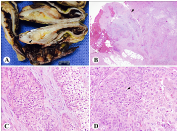 A 52 year-old male with morbid obesity and a set of large ventral hernias initially presented to our institution with symptoms of small bowel obstruction, which resolved with conservative therapy. He returned a few days later with symptoms of septic shock. A computerized axial tomography (CAT) scan of the abdomen and pelvis demonstrated large anterior and left lateral wall hernias with bowel loops, peri-colonic soft tissue standing, subcutaneous and extra-luminal air in the left hernia sac. The liver, gall bladder, spleen and pancreas appeared to be normal. A 2 mm punctate calcification was seen in the mid-pole of the right kidney with no other findings. The images through the pelvis demonstrated a decompressed urinary bladder with a catheter and an enlarged prostate. The findings were highly suspicious for incarceration and perforation of the bowel loops in the left hernia sac. Given a pre-operative diagnosis of incarcerated abdominal wall hernias with septic parameters and evidence of perforation, he underwent an exploratory laparotomy, hernia sac resection, blow-hole colostomy, and wide drainage under general anesthesia. The location of the ventral hernias was in the left upper quadrant, the right upper quadrant, and the lower midline of the abdomen. The reason for such extensive nature of hernia and symptomatology was reluctance on the patient’s part to obtain a surgery and uncertainty from the surgical team in terms of prognosis. He received the left Hernia sac repair emergently, which showed incarcerated bowel with green purulent fluid staining of the hernia sac consistent with bowel contents and perforation. The debrided sac was sent to the pathology for gross and microscopic examination with the diagnosis of acute panniculitis and abscess formation. He was stable after 5 days and received the surgical treatment of definitive repair of the ventral hernias and bowel perforation. During the surgery, a midline ventral hernia was identified with incarcerated small bowel and multiple nodules were seen at the junction of bowel wall and the mesentery. The hernia was excised and sent to pathology for gross and microscopic examination. On gross examination, the “hernia sac” specimen consisted of firm fibromembranous tissue with fully infiltrating tan-white tumor mass and focal necrosis measuring 10 cm in greatest dimension (Figure 1A). Histologically (Figure 1B-1D), the hernia sac revealed extensive tumor infiltrates in the background of desmoplastic stroma accompanied by extensive fibrinoid necrosis. The tumor showed nests or sheet-like growth pattern with predominantly squamous differentiation. The tumor cells exhibited enlarged and pleomorphic nuclei, abundant eosinophilic cytoplasm, distinct intercellular bridges and keratinization. Focal intraepithelial mucous cysts and clear cell changes were also seen. Tumor extensively involved the mesenteric adipose tissue, subserosa and muscularis propria of the incarcerated small bowel with lymphovascular invasion present in the submucosa. A panel of immunostains was performed with appropriate controls. The tumor was diffusely and strongly positive for GATA3, 34betaE12, Cytokeratin 5/6 (CK5/6) and P63, and strongly and focally positive for Cytokeratin 7 (CK7), focally and weakly positive for CDX2, negative for Cytokeratin 20 (CK20), Calretinin, D2-40 and Uroplakin III (Figure 2). The primary tumor site could not be investigated as the patient died after two weeks of surgery and no autopsy was requested. Therefore, based on the morphology and immunostaining pattern, metastatic urothelial carcinoma with squamous differentiation was rendered as the final diagnosis.