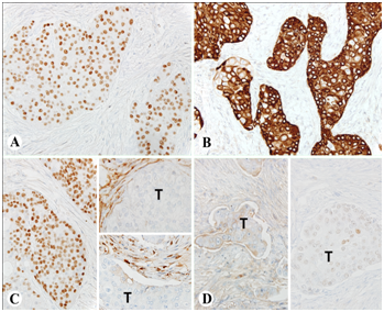 If we were to look at histology alone, primary malignant mesothelioma, metastatic prostatic adenocarcinoma, squamous cell carcinoma, and other poorly differentiated carcinomas could not be ruled out. Therefore, to distinguish high-grade urothelial carcinomas from the above listed entities was very challenging. In this case, mesothelial markers including D2-40 and calretinin were found to be negative in the tumor cells. The tumor was negative for CK20 and very focally (5%) and weakly positive for CDX2. This convincingly ruled out a gastrointestinal tract primary. High-grade urothelial carcinoma may also demonstrate squamous differentiation, which we do see in our case and can easily be confused with high-grade invasive squamous cell carcinoma. It is important to exclude the spread from an anal primary or a uterine cervical primary in female patients, where as in male patients it is important to know the condition of the prostate.6 Clinical history and imaging studies are the mainstay for any case, however, in our case, the patient presented with multiple incarcerated ventral hernias with small bowel obstruction, septic shock and other comorbid parameters, the primary tumor or an anatomical location could not be investigated. Given the morphologic overlap of high-grade UC with high-grade prostatic adenocarcinoma or squamous cell carcinoma, immunohistochemistry should routinely be performed. In the assessment of a high-grade carcinoma in the genitourinary tract where the primary site is not certain, GATA3 is promising in terms of its strong and diffuse positivity in high-grade urothelial carcinomas as compared to prostatic carcinoma or a high-grade invasive squamous cell carcinoma. GATA binding protein 3 (GATA-3) is a zinc finger transcription factor, which helps in T cell development and normal mammary gland development.6 GATA3 is used as a significant marker in urothelial carcinoma, ductal carcinoma of the breast and gynecological carcinomas with urothelial differentiation.6,7 Chang et al studied high-grade UC with muscularis propria invasion and showed that 80% of the cancers were strongly and diffusely positive for GATA3. They compared high grade UC’s with prostatic adenocarcinoma (Gleason score 9) and proposed that GATA3 is a sensitive marker for UC and the positive staining in UC is more diffuse and strong in intensity and that prostatic adenocarcinoma can be excluded as the staining was negative.8 There was differential expression and utility in terms of differentiating primary squamous cell carcinoma from the lung metastasized to the bladder in comparison to a primary urothelial carcinoma with squamous differentiation.8 In our case, GATA3 was strongly and diffusely positive within the tumor cells and this supports our diagnosis of metastatic urothelial carcinoma. Morover, Uroplakin III was negative in our case. However, it is difficult to assess its reliability and specificity in high grade invasive transitional cell carcinomas since the sensitivity is far less, 31%–60% in primary invasive UC and 53% in metastatic UCs.9 Uroplakin III also shows minimal to weak staining in cases of urothelial carcinoma with squamous differentiation.9 Squamous cell carinomas from the anal canal and cervix are known to metastasize to the peritoneal cavity and can even present in a hernia sac. In our case, the tumor is also strongly positive for CK5/6 and P63 that are also commonly used as markers for squamous cell carcinoma. However, the significance of GATA-3 in showing negative or weak staining in primary or metastatic squamous cell carcinomas supports the predominance of a urothelial origin in the hernia sac, as the GATA-3 stain was diffusely and strongly positive.10 Moreover, GATA-3 stain was studied in a number of cases of metastatic high-grade urothelial carcinoma, where its expression was compared to uroplakinIII, thrombomodulin, cytokeratin 7 and cytokeratin 20 and 92% of those cases showed diffuse and strong positivity for GATA-3 in metastatic urothelial carcinoma and none of the cases were positive for uroplakin. It was also noted that out of the 547 non-urothelial carcinomas that were studied including prostatic adenocarcinoma and colonic adenocarcinoma, the GATA-3 stain did not show any weak or focal positivity, it was completely negative.8,11,12.