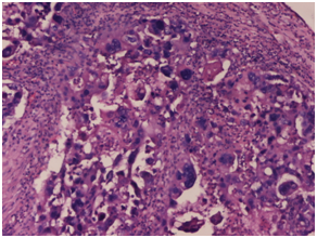 Figure 2 On microscopy, sheets or whorls of tumor cells was seen with cellular and nuclear pleomorphism, hyper chromatic nucleus and high N/C ratio with prominent nucleoli and moderate amount of eosinophilic cytoplasm. Haematoxylin and Eosin x 40X.