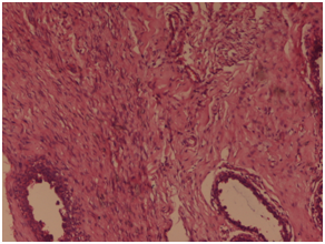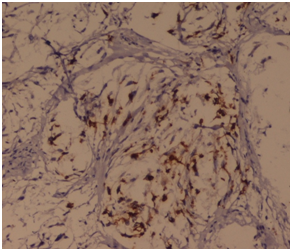 A 50years old female presented to the surgical outpatients department with complaints of painless lump in the left breast for the last 5months. On inspection a swelling was seen in the upper outer quadrant. Skin overlying the swelling appeared to be normal and the nipple was slightly deviated medially. On palpation a hard, painless mass of size 4x3cms was palpated in the breast with irregular margin, fixed to the underlying tissue and attached to overlying skin. Overlying skin showed peau de orange. Left axilla showed no enlarged lymph nodes. On mammography of the left breast, the swelling showed areas of microcalcification. Routine blood investigation showed increased leucocyte count. X-ray of pelvis and spine show no evidence of distant metastasis. On fine needle aspiration cytology, sheets and nests of pleomorphic atypical ductal cells was seen, with nuclear hyperchromasia, increased nuclear cytoplasmic ratio, prominent nucleoli and moderate amount of eosinophilic cytoplasm. A foci of benign spindle cells with wavy nuclear morphology was also seen. Based on the investigations, a diagnosis of infiltrating ductal carcinoma is made and the patient underwent modified radical mastectomy. On histopathology, grossly the tumor was located in the upper outer quadrant measuring 4.5x3x1.5 cm in dimension. A subareolar extension of tumour was seen below the nipple-areola complex measuring 2x1x0.7cm in dimension (Figure 1). Cut section showed a greyish hard solid tumor with areas of haemorrhage and necrosis. Six lymph nodes were also dissected. On microscopy, sheets or whorls of tumor cells was seen with cellular and nuclear pleomorphism, hyperchromatic nucleus and high N/C ratio with prominent nucleoli and moderate amount of eosinophilic cytoplasm (Figure 2). A foci of fascicular pattern of proliferation of peripheral nerves in wavy serpentine configuration and fibroblasts was seen associated with the tumor (Figure 3). Resection margin and nipple areola complex was free from any tumor deposits. Lymph nodes showed only reactive changes. On immunohistochemistry, the foci of nerve proliferation showed diffuse positivity with S100 (Figure 4). A final diagnosis of infiltrating ductal carcinoma with neurofibroma was given. Adjuvant chemotherapy with 6 cycles of Cisplatin (50mg) was administered along with 50G of Co-60 teletherapy. After 12months of follow up, no recurrent disease was noted.