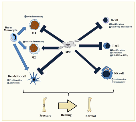 Inflammatory cells and their products (cytokines) play a critical role in bone healing. Along with growth promotive factors, inflammatory mediators also guide recruitment and differentiation of MSCs. Although inflammatory response is an important part of fracture repair, particularly during the early and remodeling phases of the healing process, long-term exposure to T cells, B lymphocytes and to inflammatory signaling has been shown to impair bone regeneration. The role of different inflammatory cells, their subtypes and products in bone regeneration is very complex and has not yet been fully clarified. Therefore, understanding the exact mechanisms of immune cells in the bone healing process and the precise routes to control them will be necessary to modulate inflammation as a new therapeutic option in bone tissue engineering and regenerative medicine. In this regard, MSCs can be effectively utilized due to their immunomodulatory effects on inflammatory cells which could change the functions and differentiation of immune cells in specific microenvironments (Figure 1).