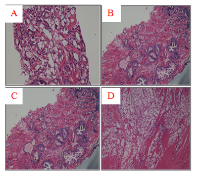 Figure 1 (A) Tru-cut biopsy specimen with abundant extracellular mucin more than 25% that defines the tumor as mucinous (H & E, x100). (B) The same tru-cut biopsy with evidence of BPH and HGPIN (H & E, x 100). (C) Higher magnification shows mucionous adenocarcinoma with glandular fusion, Gleason score 8 (3+4). Pools of mucin with single cells floating in them are clearly visible (H & E, x200). (D) Radical prostatectomy specimen with vast areas of mucinous adenocarcinoma (H & E, x40).