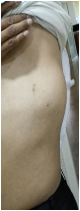 A 43years old male presented with the complaint of gradual onset of swelling in left lateral chest wall since 3 months which was preceded by trauma at his work. Swelling was associated with mild grade of pain. On examination, there was an approximately 9x4cms sized swelling fixed to the chest wall but free from the overlying skin (Figure 1). CECT scan of the chest showed soft tissue density mass causing osteolytic destruction of 5th and 6th ribs interiorly with the possible diagnosis of a sarcoma.