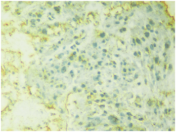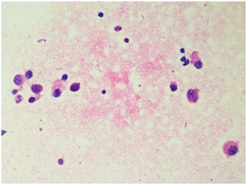 Figure 2 Pap Stain, Fine needle aspiration cytology showing atypical singly scattered cells with eccentrically placed nucleus (400x).
