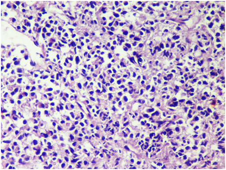 Figure 3H & E Section shows atypical small round blue cells in diffuse sheets, some with eccentrically placed nucleus and eosinophilic cytoplasm HPE (400X).