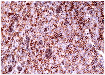 Fine needle aspiration cytology was performed which showed singly scattered monotonous population of atypical cells with high nuclear to cytoplasmic ratio. Few populations of cells revealed the bi‒nucleated forms with eccentrically placed nucleus, prominent nucleoli and basophilic cytoplasm (Figure 2). With mere cytology, it was difficult to give a definitive diagnosis so it was labelled as a small round blue cell tumor (SRBCT) with the differential diagnoses of Non‒Hodgkin’s Lymphoma, Plasma Cell neoplasm, Osteosarcoma and poorly differentiated metastatic carcinoma. Biopsy was advised for further evaluation. Tru‒cut biopsy showed diffuse sheet of monotonous population of dark blue round cells, few with eccentrically placed nucleus and eosinophilic cytoplasm. Bi‒nucleated forms were seen. This morphology was similar to cytomorphologic study done before (Figure 3). Further workups with hematologic studies, biochemical investigations and immunohistochemistry were performed to settle the diagnostic dilemma.