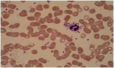 Currently, IGPD’s (Inherited giant platelet disorders) are classified into 4 broad sub-categories: the first category is based on structural defects of platelets; the second category is based on pathognomonic peripheral blood morphologic findings like neutrophil inclusions; the third category is based on associations with clinical and systemic manifestations; the fourth category is considered a benign anomaly such as Mediterranean macrothrombocytopenia.12 Very recently, another cohort of population from north eastern part of Indian sub-continent, were found to have Harris platelet syndrome or asymptomatic constitutional macrothrombocytopenia.13 This syndrome is recently described by Naina et al.13 Harris platelet syndrome is characterised by absent bleeding symptoms, mild to severe thrombocytopenia (platelets rarely <50×109/L) with giant platelets (Figure 3) (Mean platelet volume>10fL) and normal platelet aggregation study with absent MYH9 mutation.14,15 Their low platelet count causes concern while administering chemotherapy or undertaking surgical procedure. Therefore blood films have been commonly used for platelet estimation in settings of low platelet count.
