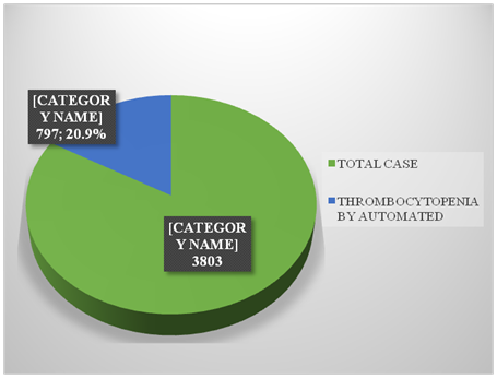Result: A total of 3803 patients were investigated for haematological parameters; 564 are males and 233 are females. On automation, 797 cases were thrombocytopenic (445 mild; 257 moderate; 95 severe thrombocytopenia) whereas by manual method only 423 cases were thrombocytopenic (238 mild; 125 moderate; 60 severe thrombocytopenia).