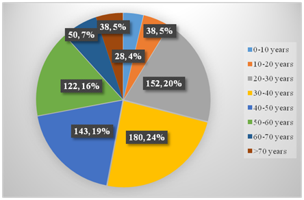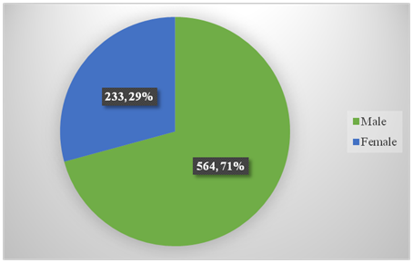 We have demonstrated that manual platelet count estimate is reproducible in trained competent hands when using a standardized methodology. A total of 3803 patients were investigated for haematological parameters for time period of 3 months i.e. 1st May to 31st July, 2017 in department of Pathology, Assam Medical College and Hospital, Dibrugarh. Out of 3803 cases, 797 cases were thrombocytopenic (20.9%) on automation in contrast to 423 (11.1%) on manual method (Figure 5) (Figure 6). Out of these 797 thrombocytopenic cases, 564 are males (70.8%) and 233 (29.2%) are females. Highest number of thrombocytopenia cases i.e. 180 cases (22.5%) falls in the age group of 30–40 years followed by 152 cases (19%) in 20–30 years (Figure 7).