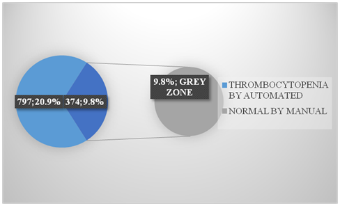 These 797 thrombocytopenic cases were subjected to manual examination. On manual examination only 423 samples out of 797 were thrombocytopenic i.e. (11.1% of total cases). So the remaining 374 cases (9.8% of total cases) which were previously diagnosed as thrombocytopenic on automation but adequate in manual method forms the GREY ZONE AREA (Figure 8).
