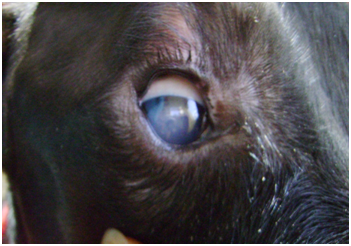 Two adult dogs were presented to the Hospital with a history of in-appetence, dullness, progressive emaciation, corneal opacity, congested mucus membranes, and persistent fever. Both the dogs were treated with antibiotics and antipyretics at local hospitals with partial relief of symptoms. Clinical examination of dogs revealed elevated rectal temperature, pulse rate, respiratory rate; pale and congested mucous membranes, corneal opacity, bilateral lacrimation and generalized debility (Figures 1& 2). Peripheral blood was collected and examined under light microscopy for haemoprotozonas which revealed the presence of motile trypanosomes. Microscopic examination of Giemsa stained blood smear revealed the presence of Trypanosoma evansi organisms in between the red blood cells (Figure 3). Further blood was collected for haematological and biochemical analysis.4 Dogs were treated with two doses of injection diminazene aceturate @3.5mg/kg body weight intra muscularly at 96 hours interval, inj. meloxicam @0.3mg/kg body weight sub cutaneous for first three days, five doses of inj. iron dextran (imferon) 10mg/kg body weight intra muscularly at 48 hours interval and oral supplementation of iron containing syrup (Dexorange) @10 gram per day daily. Post-treatment, the parasitemia was estimated by direct microscopic examination of blood and stained smears.