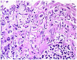 Chronic candidiasis: Prominent hyperkeratosis, pseudo-epitheliomatous hyperplasia, compressed orthokeratosis and a scaly encrustation may appear.5,6 Fungal spores and hyphae may be delineated in the absence of a Periodic acid Schiff (PAS) stain. Granulomatous dermatitis may also emerge with indeterminate granulomas comprising of lymphocytes, plasma cells, epitheloid cells and sporadic giant cells.5,6