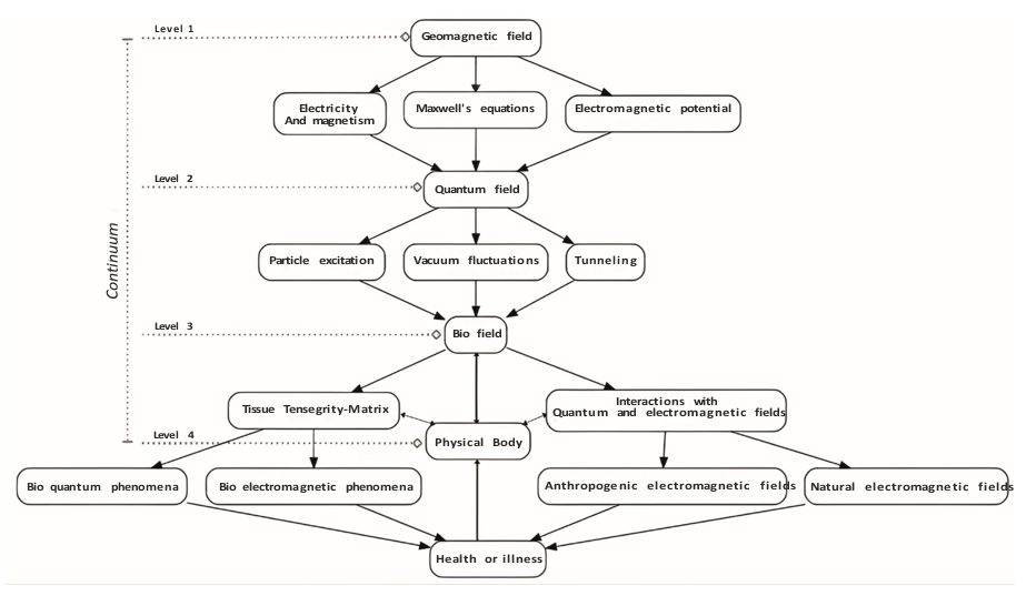 Figure 1 Energy Domain Integration Diagram (IDED) illustrating a hierarchical and dynamic energy continuum, in which health and disease manifest in the physical body as a result of coherent or disruptive interaction between multiple levels of fields (levels 1 to 4).