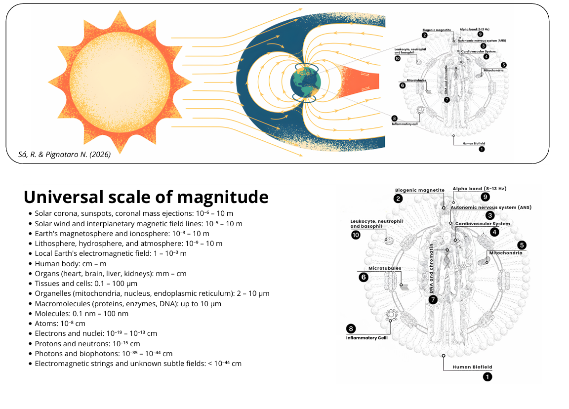 Figure 2 Represented by the Sky in TCM cosmology, interplanetary magnetic field (IMF) fluctuations synchronize directly with the human autonomic nervous system and cardiovascular rhythms, functioning as a fundamental zeitgeber (synchronizer) for homeodynamic and immunological mechanisms. The figure presents an integrated representation of the human biofield (1), encompassing multiple levels of biological and biophysical organization. Its structure indicates biogenic magnetite crystals (2), which act as potential magnetic transducers in the body. The autonomic nervous system (3) appears as one of the main electrophysiological regulators, interacting directly with the cardiovascular system (4), responsible for electrical conduction and circulation of bioelectric charges. Mitochondria (5) are shown as fundamental sources of cellular bioenergy and biophoton generation, while microtubules (6) represent structures associated with optical conduction and cytoskeletal organization. In the cell nucleus, DNA and chromatin (7) act as elements of resonance and storage of biological information. Inflammatory cells (8), which participate in bioelectromagnetic processes related to the immune response, are also represented. The figure also includes the alpha band (8–13 Hz) (9), typical of brain activity and associated with states of psychophysiological coherence. Finally, leukocytes, neutrophils and basophils (10) stand out, components of the immune system that interact with the biofield through subtle electrodynamic mechanisms.