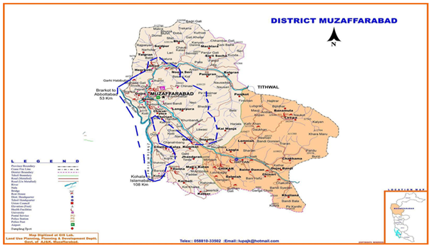 Muzaffarabad (Lat:34.35o; Long:73.47o) is the capital of the Azad Jammu and Kashmir (Figure 1) situated at the convergence of the Neelum and Jhelum rivers, surrounded by mountains. District Muzaffarabad covers an area of 2496sq.km. (19% of the total area of the AJK state. The population of Muzaffarabad is 0.770million comprising 21% of the total population of AJK. Average rainfall is 1300mm with sub‒tropical climate.29 The study area is bounded by Garri Dopatta in the East (24km away from city), Lohar Gali (2km) in West, Pattika (17km) in the North, and Kohala (32km) in the South.29
