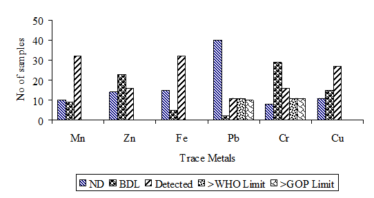 The drinking water quality of Muzaffarabad was assessed by taking samples from tap and spring waters sources of Muzaffarabad. Total of fifty three drinking water samples were collected. People use surface water for variety of purposes including drinking water, cooking and basic hygiene, in addition to agricultural and industrial activities. The obtained results were compared with WHO and GOP standards established for drinking water. Result depicted that the drinking water of Muzaffarabad is tasteless, colorless and odorless meeting WHO and GOP limits and showing good aesthetic properties. Drinking water of other cities of Azad Jammu and Kashmir i.e. Rawalakot and Bagh was found to be colorless, tasteless and odorless.6,18 Metal concentrations varied in different drinking water of Muzaffarabad ranged from 0.0 to 0.718 mg/L (Fe). Out of 6, maximum 5metals detected in only one sample (Lachraat), whereas three metals detected in the majority (43%) of the samples, followed by 2 (23%), 4 (15%) and 1 (11%). Three drinking water samples (6%) showed no detection of any metal (Appendix I).