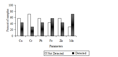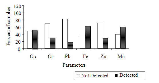 Copper, chromium, manganese, lead and zinc concentration in collected water samples were detected using atomic absorption spectrophotometer (AAS) (GBC 932plus) following Bartram & Balance.31 The detection wavelength for Cr, Cu, Fe, Pb, Mn and Zn were 357.9nm, 324.7nm, 248.3nm, 217.0nm, 279.5nm and 213.9nm respectively. Standard solutions were prepared using commercially available Lab grad stock solutions of 1000mg/L (Merk) of respective metals (3111B, APHA).32 Detection limit for each metal was calculated according to Fatoki and Awofolu33 and Javaid et al.6