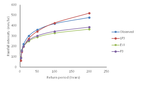 The P3 distribution as a function of the frequency factors (which are dependent on the coefficient of skew) for the study area and data under consideration, is given in Equation (12). The rainfall intensities XT considering the P3 distribution was computed at return periods of 2, 5, 10, 50, 100 and 200years as shown in Figure 2.