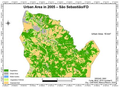 Since the 1990s, marked by the establishment of the administrative region of São Sebastião in 1993, until the year 2005, the land use and land cover classification reveal that this area experienced a substantial increase in urban coverage, totaling approximately 16 km² (Figure 3). This notable growth manifested predominantly in the South and Southeast directions, reflecting the distinctive pattern of urban expansion observed in the Federal District. Although expansion occurs in all directions, it demonstrates a more prominent trend towards the South, as identified by Oliveira and Maniçoba.7 This evolution over time indicates not only the urban development of the region but also underscores the importance of understanding and monitoring these transformations for sustainable and efficient planning.