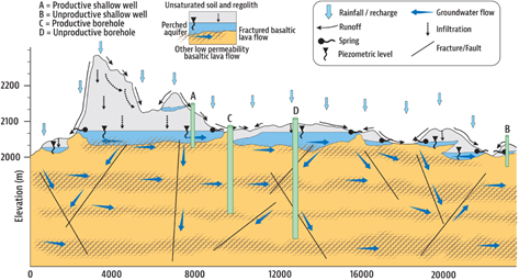 Figure 2 illustrates groundwater flow in a volcanic basaltic aquifer system, showcasing the influence of topography, fractures, and perched aquifers. Groundwater recharge occurs via rainfall, infiltrating through fractures in the basaltic lava flows. Springs are formed where groundwater intersects the surface, typically near fractures or fault zones.81 Productive wells and boreholes (A and C) are located where permeable fractures and faults enhance groundwater flow, while unproductive sites (B and D) are due to low permeability in the basalt layers. Groundwater flow is directed toward lower elevations, with faults influencing water's vertical and lateral movement across different strata.81