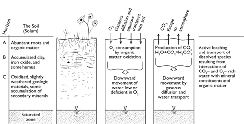 Geochemically, the most important acid produced in the soil zone is H2CO3, derived from the reaction of CO2 and H2O. The CO2 is generated by the decay of organic matter and by the respiration of plant roots. Organic-matter decay is the main source and can be represented by the reaction