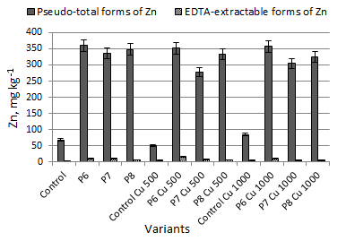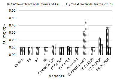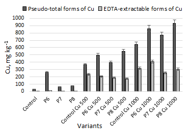 The levels of added copper - 500 and 1000 mg kg-1 soil (under the form of Cupric acetate solution) were consistent with the national law and represented maximum and intervention concentrations of copper for industrial and production sites respectively.25 A total of 12 variants were tested: Control, P6, P7, P8 without added Cu; Control Cu500, P6 Cu500, P7 Cu500, P8 Cu500 with 500mg kg-1 added Cu; Control Cu1000, P6 Cu1000, P7 Cu1000, P8 Cu1000 with 1000mg kg-1 added Cu. In a previous study,26 pseudo-total (PT) forms of heavy metals, extracted by aqua regia and bioavailable forms, extracted by 1M NH4NO3 were assessed and reported. Statistically significant correlation between bioavailable forms of Cu extracted by 1M NH4NO3 and Cu concentration in plants (R=0.798) was obtained. A pot experiment was carried out with the investigated soils in a greenhouse, using 1 kg containers in three replications with test plants (Eruca sativa). Plant biomass was harvested 21 days after sowing and heavy metal concentrations in plants were analyzed. Plant samples were digested by concentrated HNO3 and H2O2 on a sand bath until clarification of the solution and after that heavy metal concentrations were analyzed by AAS.27 Soils from the greenhouse experiment were used for further chemical analyses. Soils were sieved through 1 mm sieve (non-rhizosphere soil) and major soil properties were analyzed. The cation exchange capacity was determined by the method of Ganev and Arsova.28 Soil reaction was measured in 1:2.5 – soil: water suspensions. Soil organic matter was analyzed by the method of Tyurin.29 Heavy metals in soils were determined by the following methods: water soluble forms in soil water (ratio 1:10) and shaking for 1 hour;30 0.01M CaCl2 extractable forms in soil:sollution ratio (1:10) and shaking for 2 hours;13 EDTA extractable forms in 0.05M EDTA (pH 7), soil:sollution ratio of 1:5 and 30 minutes of shaking.31 Pseudo-total forms of metals (PT) were analyzed by aqua-regia digestion.32