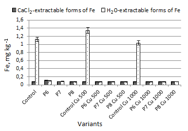 Pseudo-total forms of iron in the Control variant (Figure 6) were close to the average values in soils worldwide 35 400mg kg-1 (~3.5%).8 In the Technosols (P6, P7 and P8) pseudo-total forms of Fe were considerably higher, 5 – 5.5 %, due to the activity of the steel works. The addition of copper, similarly to lead has again caused a decrease in pseudo-total forms of Fe in Technosols (Figure 6). A similar trend, as for Cu was observed for Fe, regarding the proportion of EDTA extractable forms (7.8 and 57.5mg kg-1) (Figure 7) from pseudo-total contents, i.e. higher proportions were found in the control soil than in Technosols. Soluble forms of Fe extracted by CaCl2 and H2O (0.08 - 1.35 mg kg-1 are presented in Figure 8). Only in the control soils (Control, Control Cu500, Control Cu1000), apart from Cu addition, H2O extracted more Fe than in the other variants. As regards Fe, a significant positive correlation between EDTA and H2O extractable forms was observed (R=0.875; R2=0.766), (Table 2). At the conditions of the Technosols (pH=7.6 - 7.7) iron is weakly extracted by EDTA, CaCl2 and H2O extractants. This could be due to the fact that in alkaline conditions the precipitation of iron is possible.8 As an essential element for plant growth and development, concentrations of Fe in food are not regulated. In our study Fe concentrations in plants ranged from 156mg kg-1 in the control variant to 1210mg kg-1 in the P7 Cu500 variant (Table 3) pointing at contamination by the activity of the metallurgical smelter and accumulation of iron in plant biomass. The content of Fe in plant biomass was negatively correlated with the contents in water and EDTA-extracts (R=-0.684 and R=-0.731), (Table 4), making those extractants unsuitable for predicting Fe uptake by Eruca sativa plants at the conditions of increasing Cu loadings. The reason could again be the speciation of Fe into different complexes in solution and unavailability of the specific Fe-organic complexes extracted by 0.05M EDTA in the soils studied.