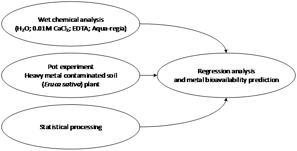 Heavy metal analyses were performed with a high resolution radial viewing ICP - OES system - HORIBA JY ULTIMA 2 (Jobin Yvon, Longjumeau, France). The European standard EN ISO 11885 “Water quality determination of selected elements by inductively coupled plasma optical emission spectroscopy (ICP-OES)” was used as a method for the determination of Cu, Fe, Pb and Zn in soil extracts. Reagents of highest purity grade were used: 30 % HCl and 65 % HNO3 (Suprapur, Merck) and deionized water. The stock solutions of the elements of interest Cu, Zn, Pb, and Fe (1mg mL-1) were prepared by using Merck mono – element standard solutions, traceable to SRM from NIST 1000 mg L-1 Certipur®. The accuracy and the precision of the analytical results were experimentally demonstrated by certified reference material TMDA-51.2 from National Water Research Institute - fortified water for trace elements, prepared from Lake Ontario water, filtered, diluted, and preserved with 0.2 % nitric acid. Statistical processing of datacorrelation and regression analysis were performed by STATGRAPHICS Centurion.