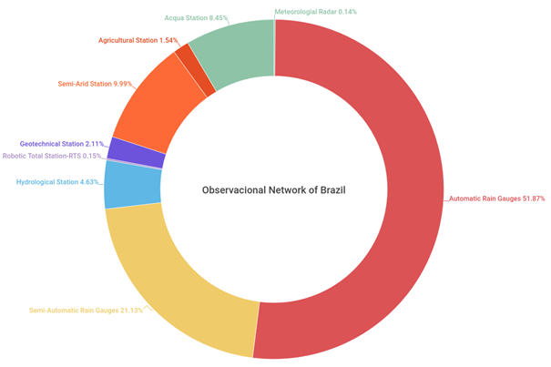 Regarding hydrological stations, Brazil has 301 units closely monitoring water levels in rivers, reservoirs, and other water sources. For geotechnical purposes, 137 stations have been registered, responsible for collecting essential data for studies related to soil behavior and geotechnical stability. Considering the semi-arid characteristic of some regions, 650 specific stations have been deployed to monitor the climatic conditions in these environments. Additionally, there are 100 agricultural stations, focused on obtaining data related to agriculture and its impact on the environment. Lastly, the 550 Acqua stations stand out, providing information on water quality and the monitoring of water resources in different regions of Brazil. These results reflect significant advancements in observation and data collection infrastructure in Brazil (Figure 1). According to the National Center for Monitoring and Early Warning of Natural Disasters - Cemaden (2022), the exclusive use of radars is not sufficient to issue alerts quickly, and it is necessary to equip municipalities with more effective devices, such as rain gauges. In comparison, Japan, for example, has 20 weather radars and has a network of 17,000 rain gauges. In contrast, in Brazil, there are only 4.750 rain gauges, even with a decades-old culture and an established network, the country still presents this diagnosis, which makes it essential to increase the number of rain gauges in the country.