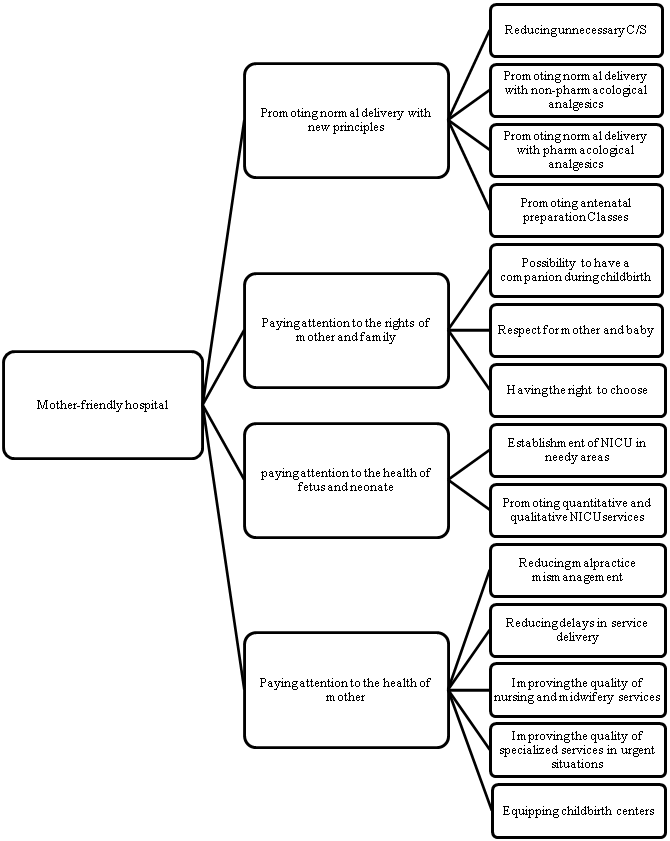 In reaction to high growth of cesarean section (C/S) rates, the Coalition for Improving Maternity Services in the United States recorded its first consent to improve normal delivery.1 Along these lines, the term "mother-friendly hospital" was born for the first time in 1996. A mother-friendly hospital is a place in which every mother, at any time during pregnancy, childbirth, and up to six weeks after delivery with any condition of health, receives an effective and productive health service.2 The targets of mother-friendly hospitals included improving the quality of normal birth care, decreasing costs, and being attentive to the rights of mother and neonate.3 The principles of these hospitals include the natural process of delivery, women’s empowerment, autonomy and independence, interventions based on specific indications and not routine.1