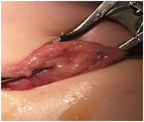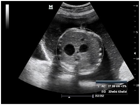 Newborn female was born at 37 weeks 5 days as a product of a second pregnancy, with prenatal diagnosis of duodenal atresia and esophageal stenosis (Figure 1). Due to a previous cesarean section and rupture of the membranes, an emergency caesarean section was performed. Birth weight was 2100 grams APGAR scores were 8–9 at…min. A thoracic-abdominal radiograph was performed, showing thorax without alterations and an image suggestive of duodenal atresia (Figure 2). An echocardiogram CIA 0.5, PCA: 0.2X0.3 showed mild dysplasia of aortic and pulmonary valves. Abdominal laparotomy at 24hours of life, revealed duodenal stenosis secondary to annular pancreas, intestinal malrotation and non-meconium plastic peritonitis without evidence of perforation. The defect was corrected by adhesiolysis, duodeno-duodenal anastomosis and incidental appendectomy.