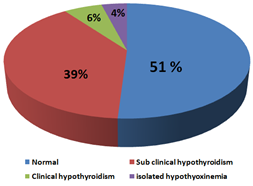 Results: Our study revealed that most of pregnant women had normal thyroid functions (51%), while subclinical hypothyroidism (39%) was the most prevalent disorder followed by clinical hypothyroidism (6%) and isolated hypothyroxinemia (4%).