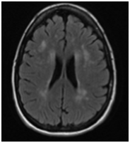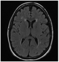 At 34 weeks of gestational age the patient was admitted to the hospital due to severe right eye pressure-like headache associated with transient right upper limb weakness for 24 hours. Her blood pressures were normal and preeclampsia was ruled out. The physical exam performed by the neurologist was significant for mild flattening of right nasolabial fold. There were no other abnormal neurologic or psychiatric findings. The MRI (Figure 1) showed multiple small foci of abnormal signal in the cerebral white matter consistent with micro vascular ischemic changes but no acute pathology. This episode was self-limited and the patient was discharged home in stable condition after 10 days.