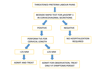 If the patients with positive phIGFBP-1 test result but cervical length more than 25 mm had been admitted, observed and treated only if pain persisted, treatment in many could have been safely avoided. There were 23 patients falling in this group who tested positive for phIGFBP-1 but had cervical length above the cutoff of 25mm. Among these, 17 patients delivered after 34 gestational weeks in whom treatment could have been avoided safely, whereas six patients had early preterm birth. All these cases require admission and observation but treatment needs to be started only in certain cases of continuing symptoms/signs. The data has been translated into the following algorithm Figure 2 which we suggest has practical utility without compromising maternal or perinatal safe try.