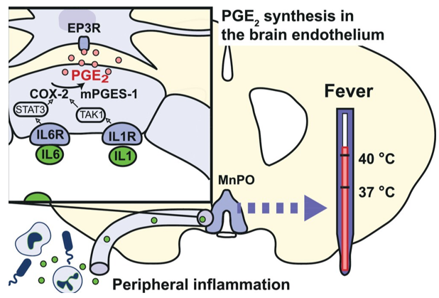 Figure 1 IL-1 and IL-6 elicit PGE2 synthesis in brain endothelial cells via IL-1 receptor type 1 (IL1R) and IL-6 receptor α (IL6R) and Tak1/NfκB and STAT3 signaling, respectively. The PGE2 binds to receptors on thermoregulatory neurons in the median preoptic nucleus (MnPO).5