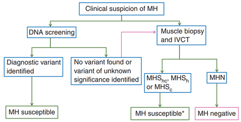 Treatment in the case of a suspected episode of MH, all triggering agents should immediately be withheld and surgery rapidly aborted; if surgery must be continued, intravenous anesthetics and non-depolarizing muscle relaxants can be used. Hyperventilation, cooling of the patient, and administration of dantrolene, an RYR1 antagonist, should occur concurrently.2,3 Dantrolene should be given at a dose of 2–2.5 mg/kg every five minutes until the patient stabilizes. If more than 10–20 mg/kg of dantrolene is given in total with no improvement, a diagnosis of MH should be reconsidered. 2,3 Hyperkalemia and arrhythmia can be treated with standard medications. However, it is crucial to avoid calcium channel blockers, as these will result in cardiac arrest in combination with dantrolene.2,3 It is recommended that blood gas analysis, blood glucose, electrolyte, lactate, creatine kinase, urine and blood myoglobin, and coagulation studies be evaluated at the onset of MH and repeated at 30 min, 4 h, 12 h, 24 h, and 48 h. If dantrolene is not readily accessible, successful management of MH may be possible via alternative means. Measures such as dopamine, dobutamine, hydrocortisone, heparin, and furosemide administration, in addition to other supporting therapies such as magnesium sulfate. Fluid challenge should be administered IV to lower the body temperature and to improve kidney functions and prevent myoglobin-induced renal failure. Additional cooling measures can include placement of ice packs around the large superficial blood vessels of the body and administration of cold water lavages and enemas.7–9 Recrudescence of MH may also be possible, in which signs of the disorder return after proper treatment of an initial MH episode.10–12 Approximately 20–25% of patients will experience a recrudescent event, therefore, patient should be admitted to ICU immediately (Table 2).2,3