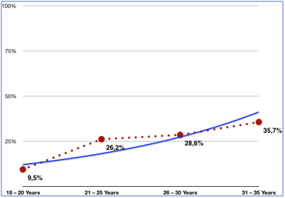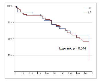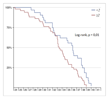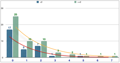 There was no significant defence regarding parity among the two groups [p value of 0.86], even taking each para and compare both groups, there was no significant defence (Graphs 3–9). Mean gestational age at delivery was 35 weeks (SD 1,3) and 33,2 weeks (SD 1,1) for cervical dilation <2 and ≥2 respectively [P=0,039]; 54% and 45% both groups respectively had Atosiban for 48 hours. 19,4% and 26% of both groups (<2cm and ≥2cm respectively) delivered in the 1st 48 hours (0,49) see the graph for the Preterm delivery diagnosis-delivery interval. 22,5% and 46% of both groups respectively delivered within 7 days of the diagnosis (p=0,034).
