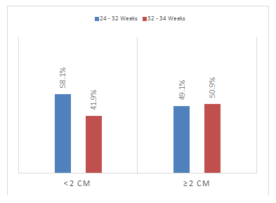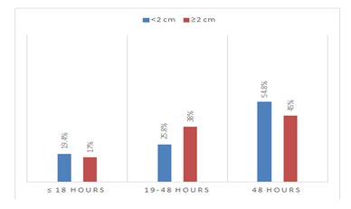 During the study period (Graph 1), a Total of 84 cases were studied. There is a increment in the rate of PL as the age goes up that could be explained by mean maternal age of 27years and graph 3 of parity could help understand that as half of our cohort are primigravida of whom 45% are above 25years, para 1 and 2 comprise 40% of the PL patient and in both groups >80% are above 25years. Mean cervical dilatation at presentation was (1,9±0,25cm) with median of 2cm. Two groups were made according to cervical dilation (<2 and ≥2cm) (Graph 2) (Table 1).