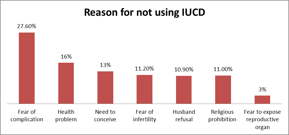 Federal Ministry of Health initiated the IUCD scale-up, expanding access to IUCD and constructing new health centers in 2011 to increase access to long-acting family planning services. Consequently, there appear to be huge discrepancies in the utilization of LACMs which could be attributed to several factors. A retrospective study conducted in India in 2012, Lack of information about the method was the main reason for poor utilization in Indian FP clients.6 Another qualitative study conducted in Pakistan in 2012, Reasons mentioned for low utilization of IUCD utilization were inadequate counseling about the method by service providers and misconceptions about the method.7
